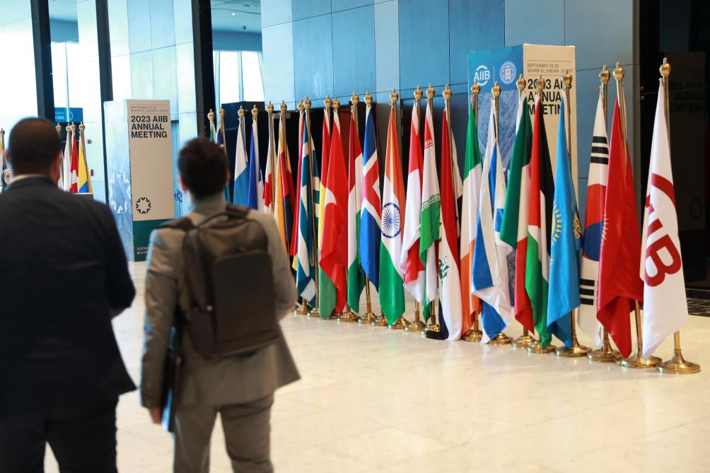 9月26日,在埃及沙姆沙伊赫舉行的亞投行第八屆理事會(huì )年會(huì )期間,參會(huì )者走過(guò)亞投行成員國國旗。新華社記者隋先凱攝