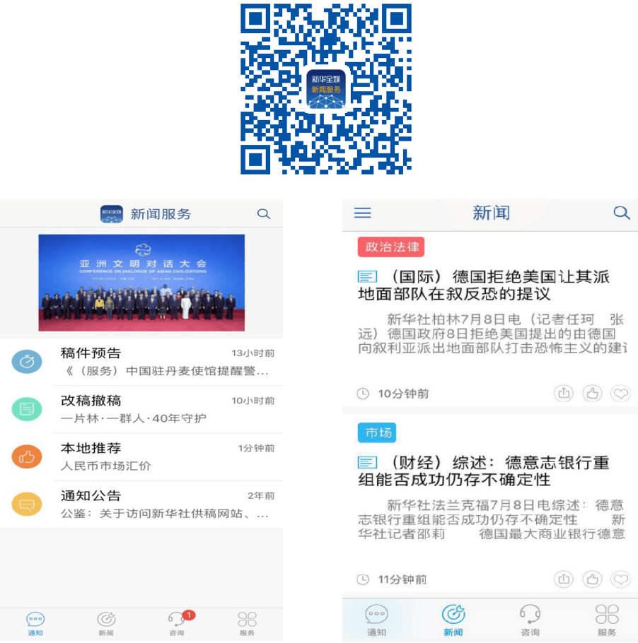 APP客戶(hù)端。用戶(hù)可以在手機上掃碼安裝APP,直接在手機上瀏覽所訂購的新聞及重要稿件預告、改撤稿通知等內容,還能夠與新華社后臺技術(shù)人員進(jìn)行交流和咨詢(xún)。